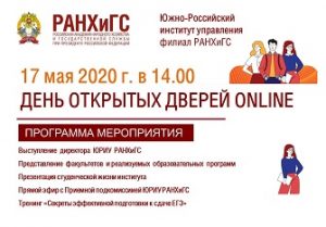 Южно-Российский институт управления РАНХиГС при Президенте РФ приглашает принять участие в Дне открытых дверей, который пройдет 17 мая 2020 в 14.00 в онлайн-формате. Старшеклассники и их родители смогут узнать информацию о Приемной кампании 2020 года, познакомиться с факультетами и студенческой жизнью института, пройти тренинг по подготовке к сдаче ЕГЭ. Ссылка для регистрации на мероприятие: https://uriu.ranepa.ru/news/?ELEMENT_ID=320156